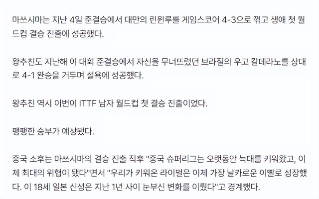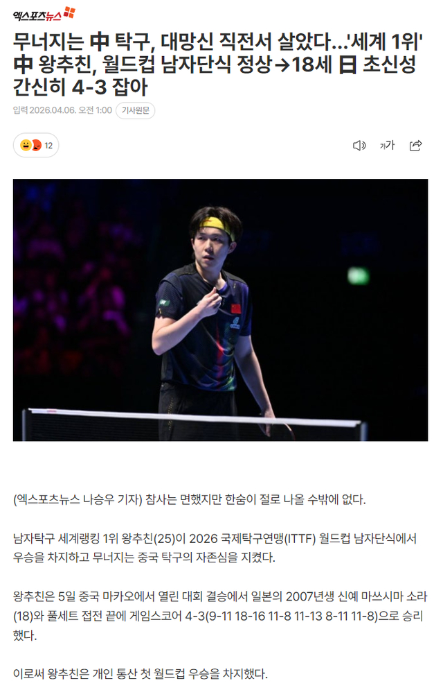 北京时间4月6日晚,韩国媒体《世博新闻》专门谈到了‘养狼计划’这个话题,他们写道:世界排名第一的王楚钦获得世界杯冠军——但面对18岁的松岛辉空非常艰难地4-3涉险过关。